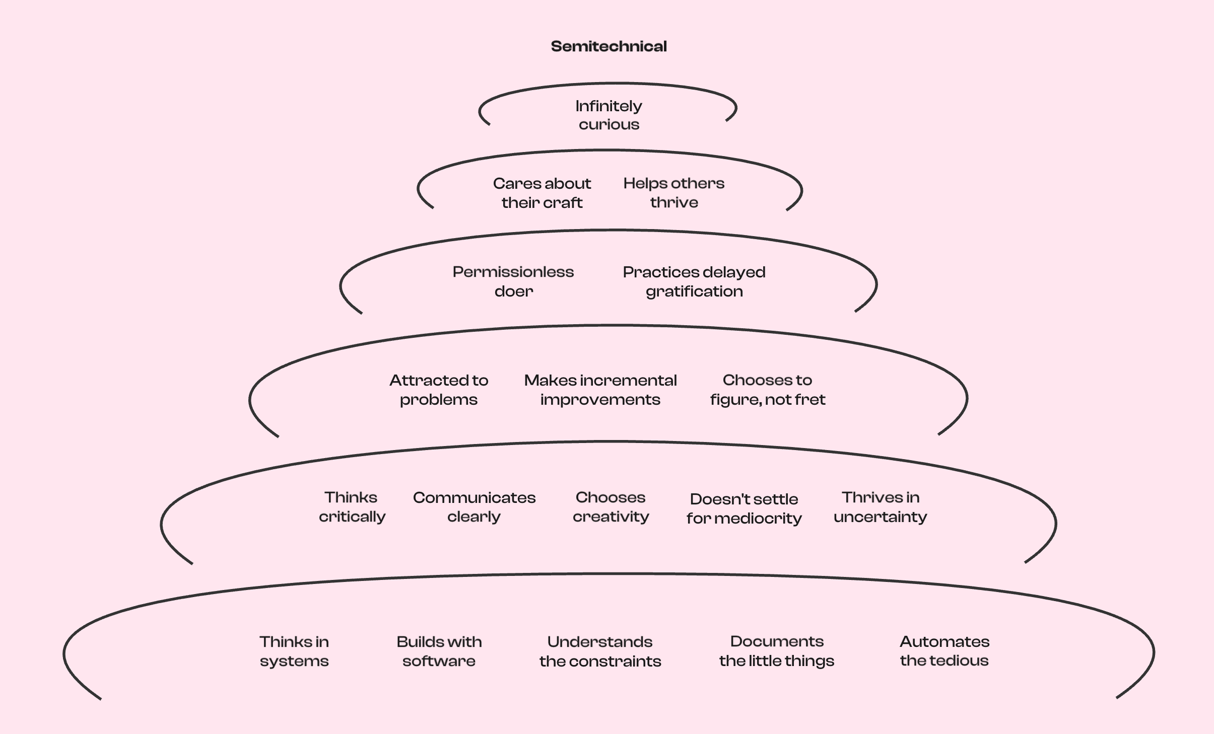The model depicts the 18 core traits of a semitechnical. The bottom layer lays down the “technical skills” that need to be learned – everything else is an attitude, part of one’s mindset.