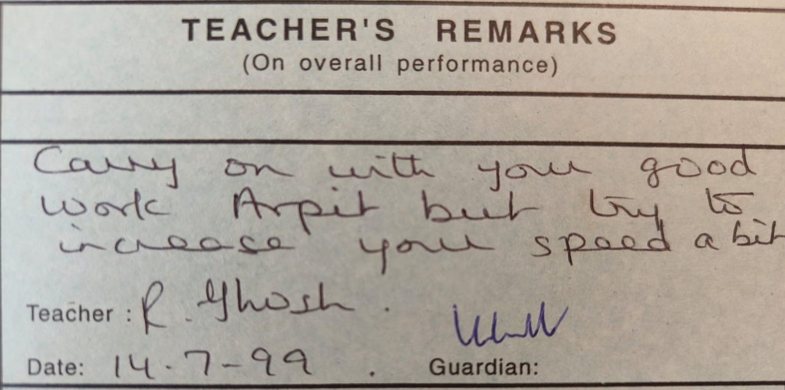 I did alright though. I was always told that I needed to work faster but I struggled with that. Below, my fourth-grade teacher writes, “Carry on with your good work Arpit but try to increase your speed a bit.”